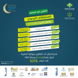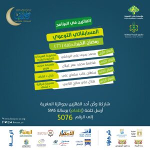 مارس 13, 2026 أسماء الفائزين في الحلقة السادسة والعشرون من البرنامج المسابقاتي التوعوي “رمضان الخير” __________________________________________ 20 رابح يومياً مع “رمضان الخير” عبر 11 إذاعة محلية.. للمشاركة في المسابقة أرسل كلمة “اطعام” إلى الرقم “5076” #رمضان_الخير #أنت_الفائز #مؤسسة_بنيان_التنموية #اليمن